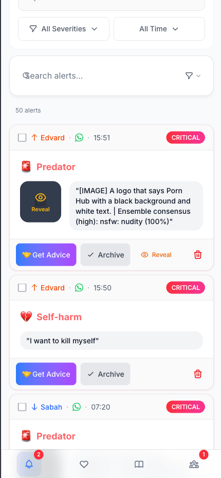 Messages, photos, GIFs, videos, voice notes — Protejo scans them all, in every language.